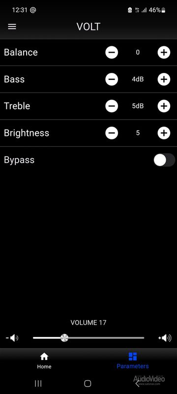 В приложении, как можно видеть, также доступна регулировка тембров по НЧ и ВЧ, баланса и яркости подсветки кнопок. Предусмотрен режим Bypass, в котором сигнал подаётся на вход усилителя мощности в обход регулятора громкости. Это пригодится, если усилитель будет работать в системе домашнего кинотеатра с внешним процессором.