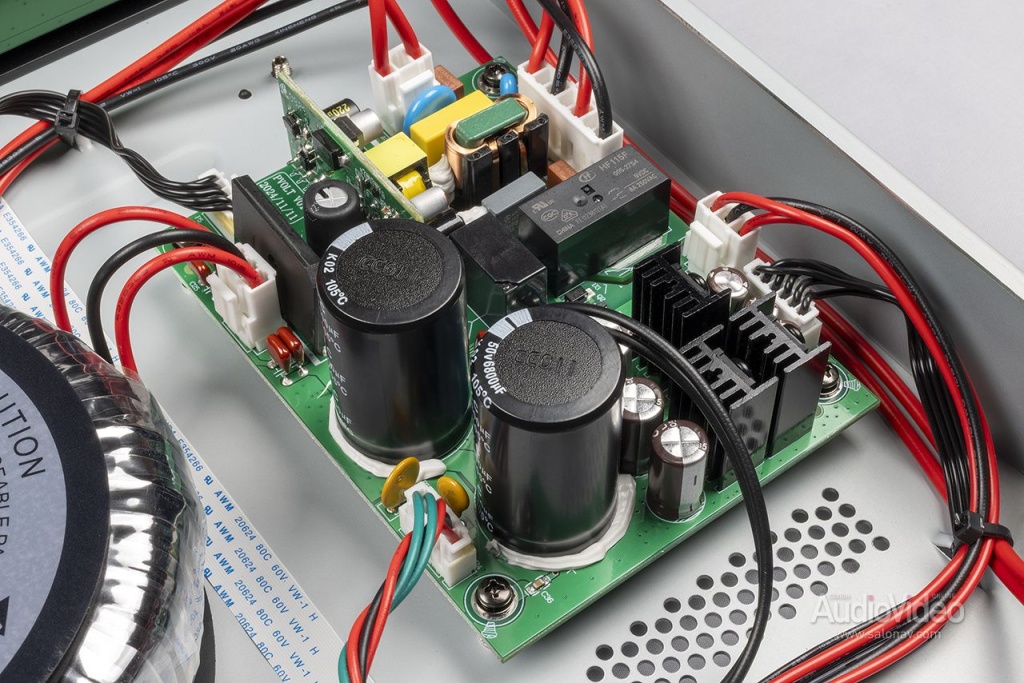 Плата питания несколько разочаровала — ёмкость буферных конденсаторов 6800 мкФ х 50 В на оба канала. Её может оказаться недостаточно для работы с низкоомной нагрузкой — не зря в спецификациях усилителя указано оптимальное сопротивление акустики 8 Ом.