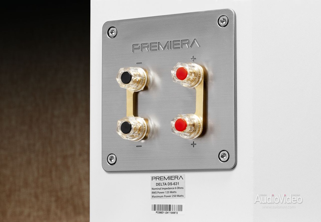 Нынешний объект исследования, Premiera Delta DS-631 — старшие и самые крупные системы в текущей линейке. Корпуса высотой чуть более метра сужаются к задней части, поэтому имеют более высокую жёсткость по сравнению с традиционными прямоугольными. Изогнутые стенки (которые, кстати, дороже в производстве) тоже не прихоть дизайнеров — благодаря отказу от параллельных боковых панелей удалось снизить внутренние отражения, негативно влияющие на линейность частотной характеристики. Основанием корпуса служит толстая плита из MDF, к которой приклеиваются эластичные ножки. Предусмотрены и резьбовые отверстия для конусов, которые имеются в комплекте.