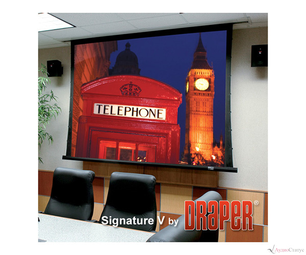 Draper Signature/Series V - система постоянного натяжения на петлях, создающая идеально ровную поверхность. Возможны поверхности M1300, М2500, HiDef Gtey или Cineflex для обратной проекции. Стандартно выпускается с Extra Drop 30 см черного цвета. Варианты комплектации: Extra Drop, Серия V - до 14' общей высоты экрана белого или черного цвета (белый - стандартный). Увеличивает длину кейса. Черные маскирующие полосы - дополнительные для экранов Серии Е форматов AV; стандартные для остальных форматов Серии Е и всех экранов Серии V. Управление может быть встроено в корпус. В этом случае длина корпуса увеличивается...